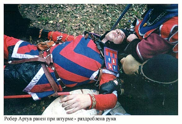 ![]() | Робер Артуа ранен. Спрыгнув в ров штурмуемой крепости, не успел оттуда выбраться и ему раздробили руку камнем. | ![]() |