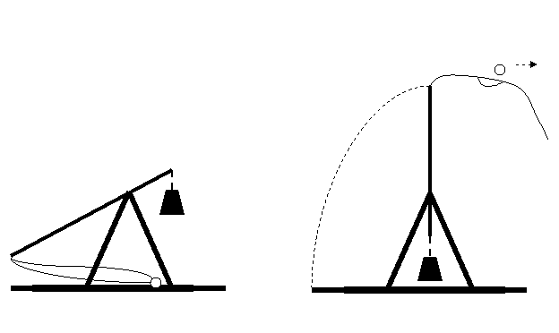 Фрондибола - метательная машина навесного действия, метала камни весом 100 кг на расстояние до 70 метров, а камни весом 30 кг до 200-т метров. Состоит из пращи прикрепленной к одному концу рычага, а к другому концу рычага прикреплен ящик с землей весом несколько тонн. На рисунке показано как происходит выстрел.